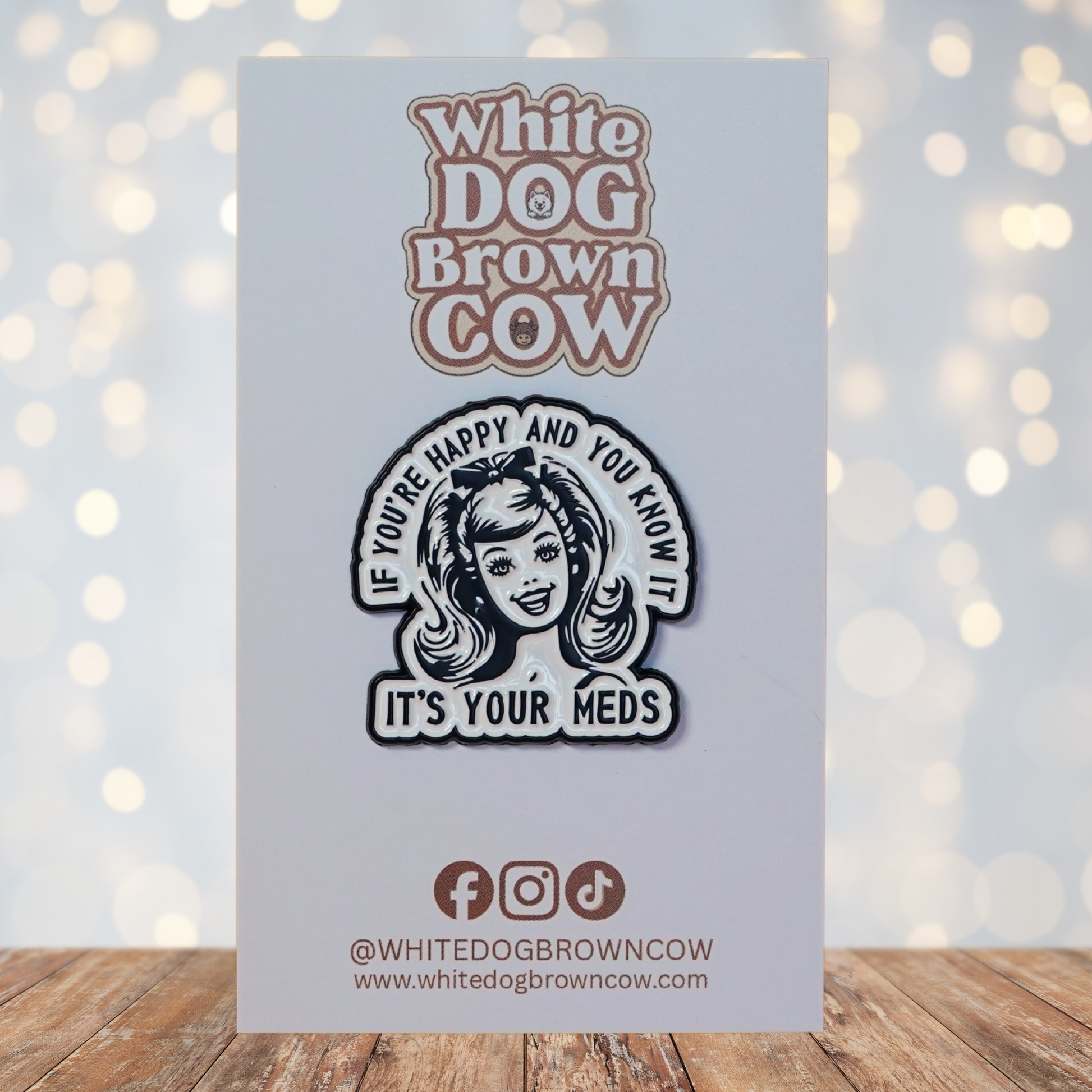 πŸ’Š This pin is dark humour at its finest - a retro-sass, slightly unhinged wink that blends vintage cheerfulness with modern self-awareness. It’s ironic, bold, and unapologetically tongue-in-cheek, perfect for people who cope with life using sarcasm, pop-culture cynicism, and a well-timed sense of humour about keeping it together (mostly).